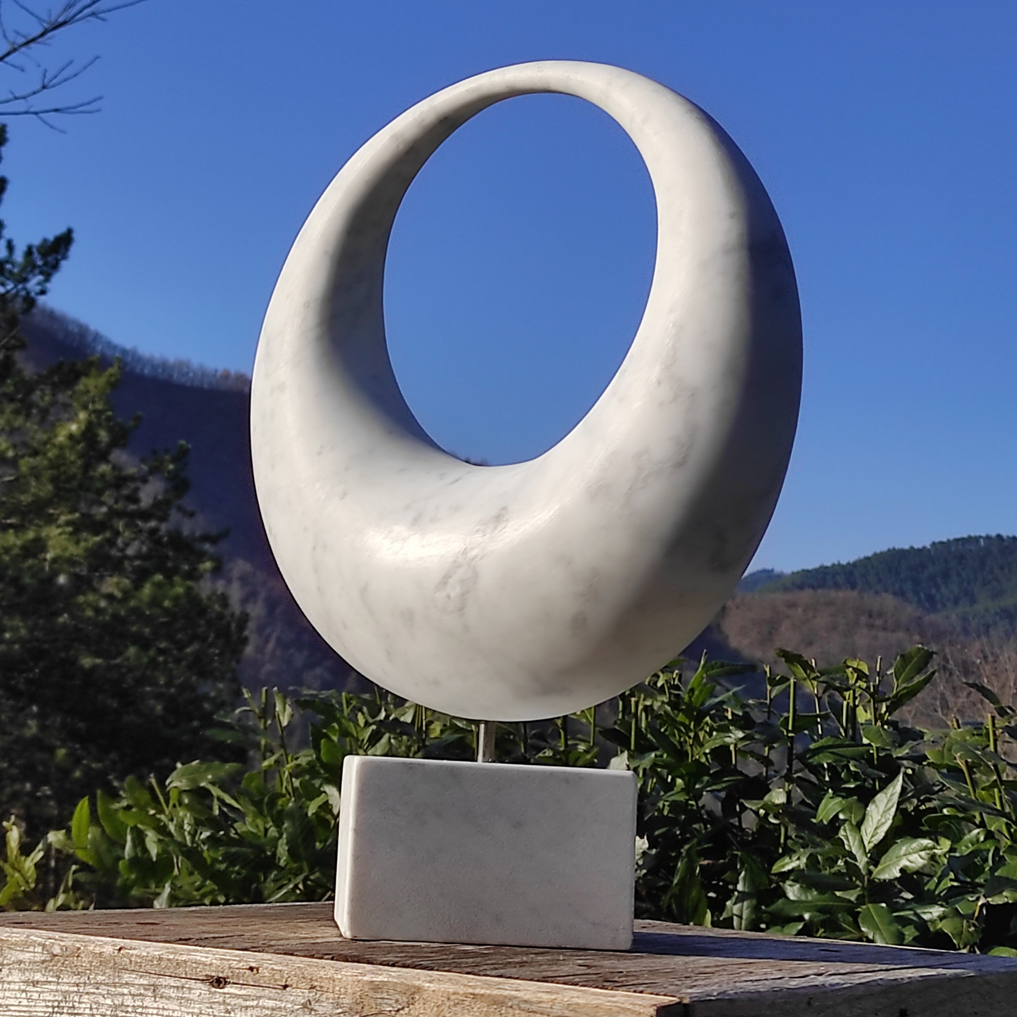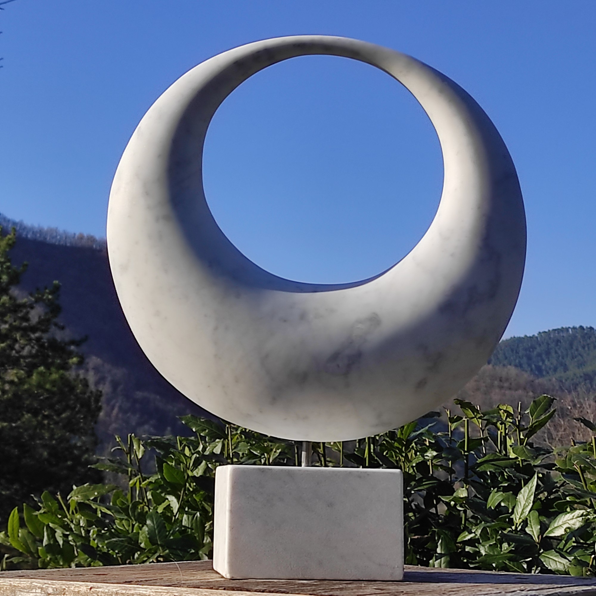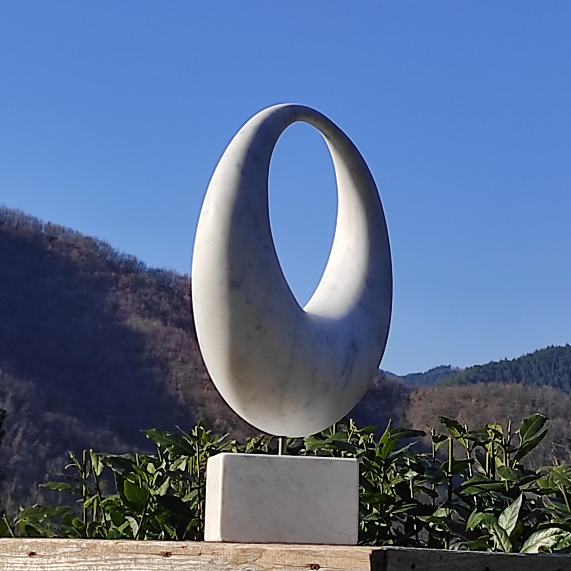 Originally the design of this artwork is generated by two cones: their bases are connected and their points too. The marble cones are bent to create a new inner space, through which the viewer looks further to the horizon.