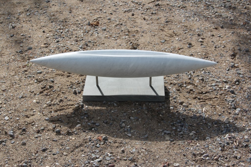 Levante is an Italian word meaning rising (Sol Levante = rising sun). Levante means also East. Originally the design of this artwork is generated by two cones: their bases are connected and their points too. The marble cones are bent to create a new inner space, through which the viewer looks further to the horizon. Levante is hope and potential, reflecting the attitude of its author, who keeps himself open to the future and lets new creative ideas rise from his inner space. In this historical moment Levante is also a call for peace.